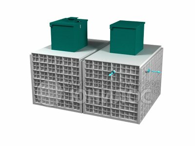 Описание: Двух корпусная установка. Оптимально подходит для комфортного проживания до 100 человек с потребительским набором сантехнического оборудования 11 унитазов, 15 раковин, 7 душевых кабины и 4 ванные. Перерабатывает поступающие сточные воды без запаха и шума. На выходе выдаёт 99% очищенную воду, готовую к повторному использованию и не требующую дополнительной доочистки в полях фильтрации. Предназначена для домов с низким уровнем заложения трубы 85-140 см от уровня грунта. Срок полезного использования 50 и более лет. Устанавливается в любых типах грунта.По необходимости может комплектоваться принудительным выбросом очищенной воды (насос+емкость)